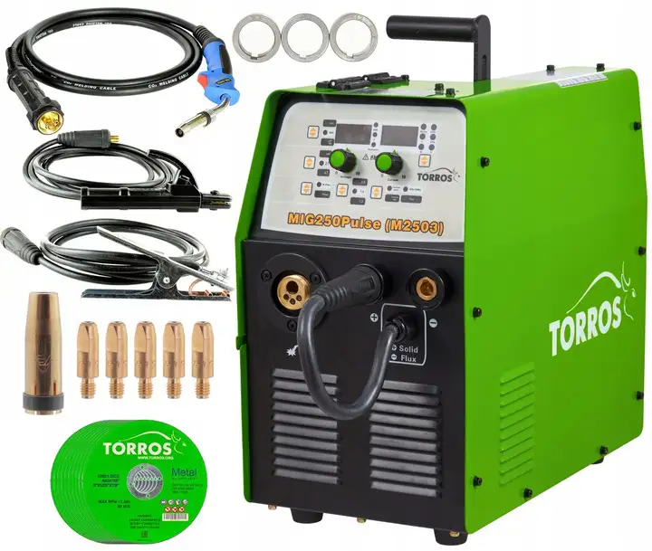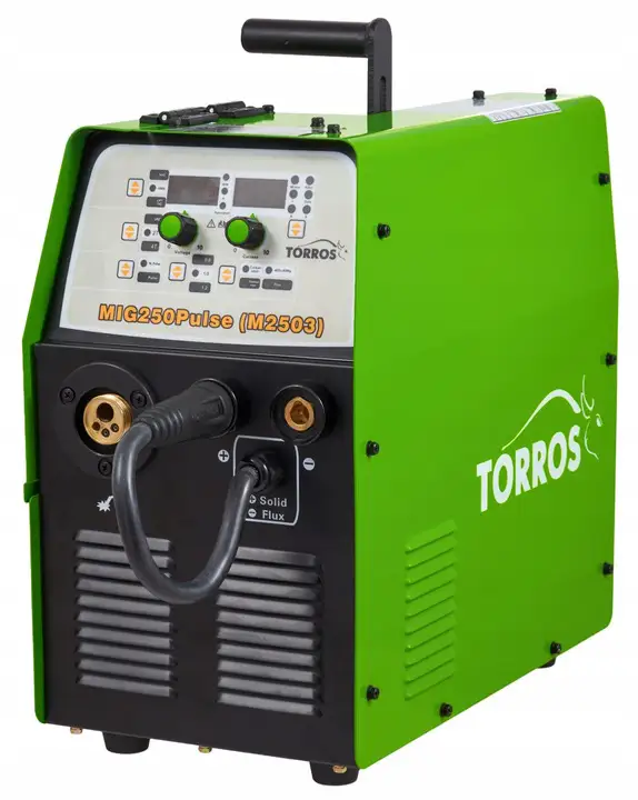 Spawarka Migomat Torros MIG250 Puls Synergia M2503 to profesjonalny inwertorowy półautomat spawalniczy przystosowany do spawania stali, stali nierdzewnej, aluminium i innych metali.