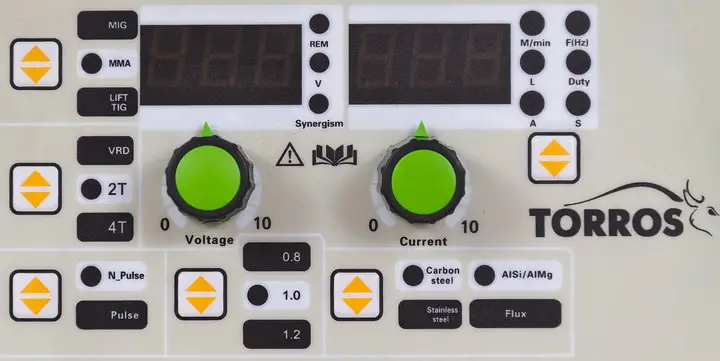 Zaletą tego modelu jest możliwość regulowania Amperów i Woltów w trybie synergia. Równiez możliwość przejścia do regulowania prędkości podawania drutu.